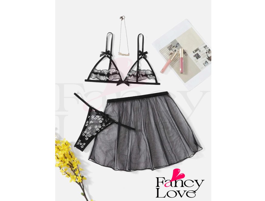 Hermoso set de 3 piezas con detalle de margaritas blancas, sujetador y tanga hilo – SHEIN: